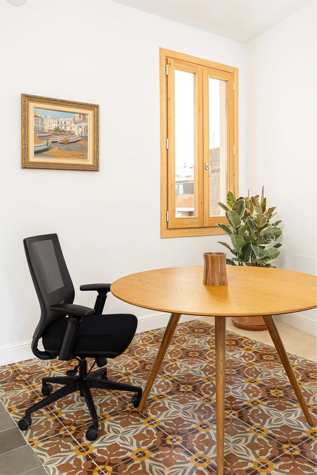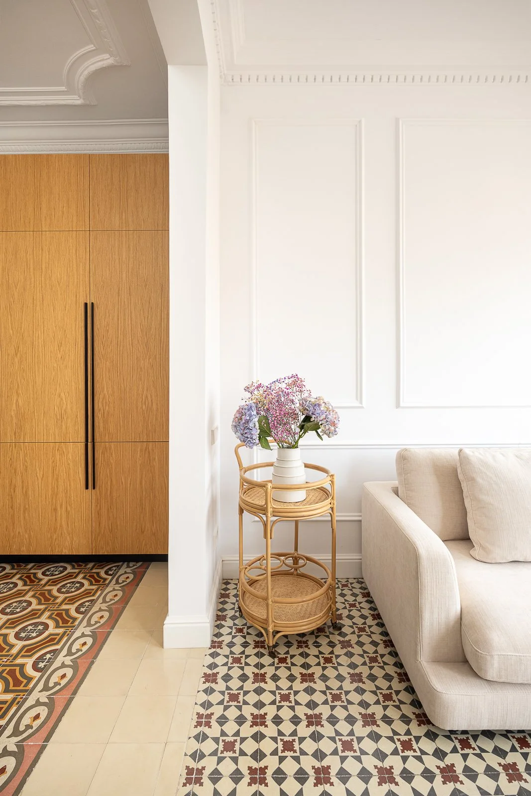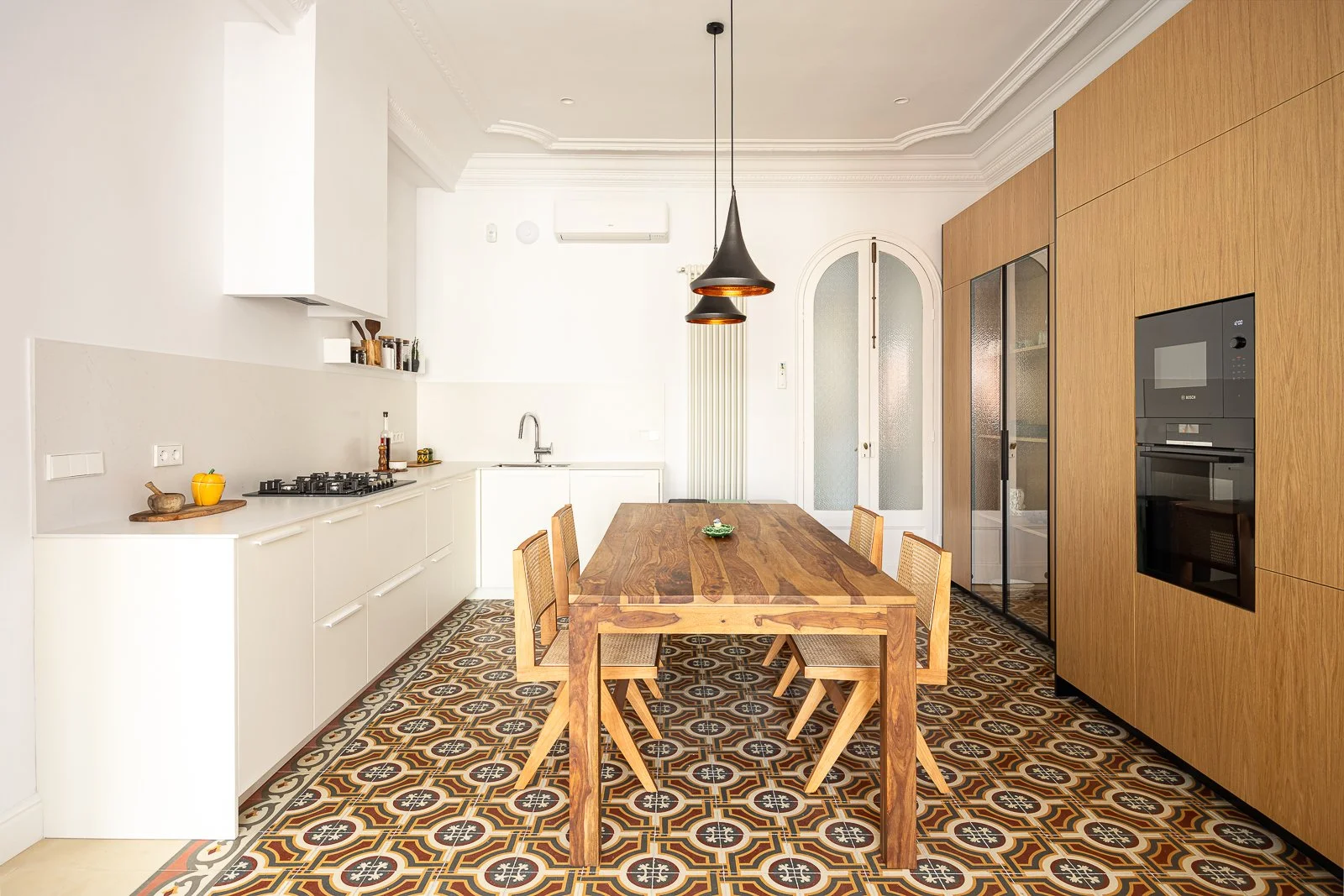 Highlighting L'Eixample's modernist architecture featured high ceilings, a gallery with wood windows, hydraulic floors, and cornices